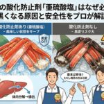 カニの場合は、殻や身に含まれるアミノ酸が酵素によって黒くなるスイッチを、この亜硫酸塩が「カチッ」とオフにしてくれているイメージです。