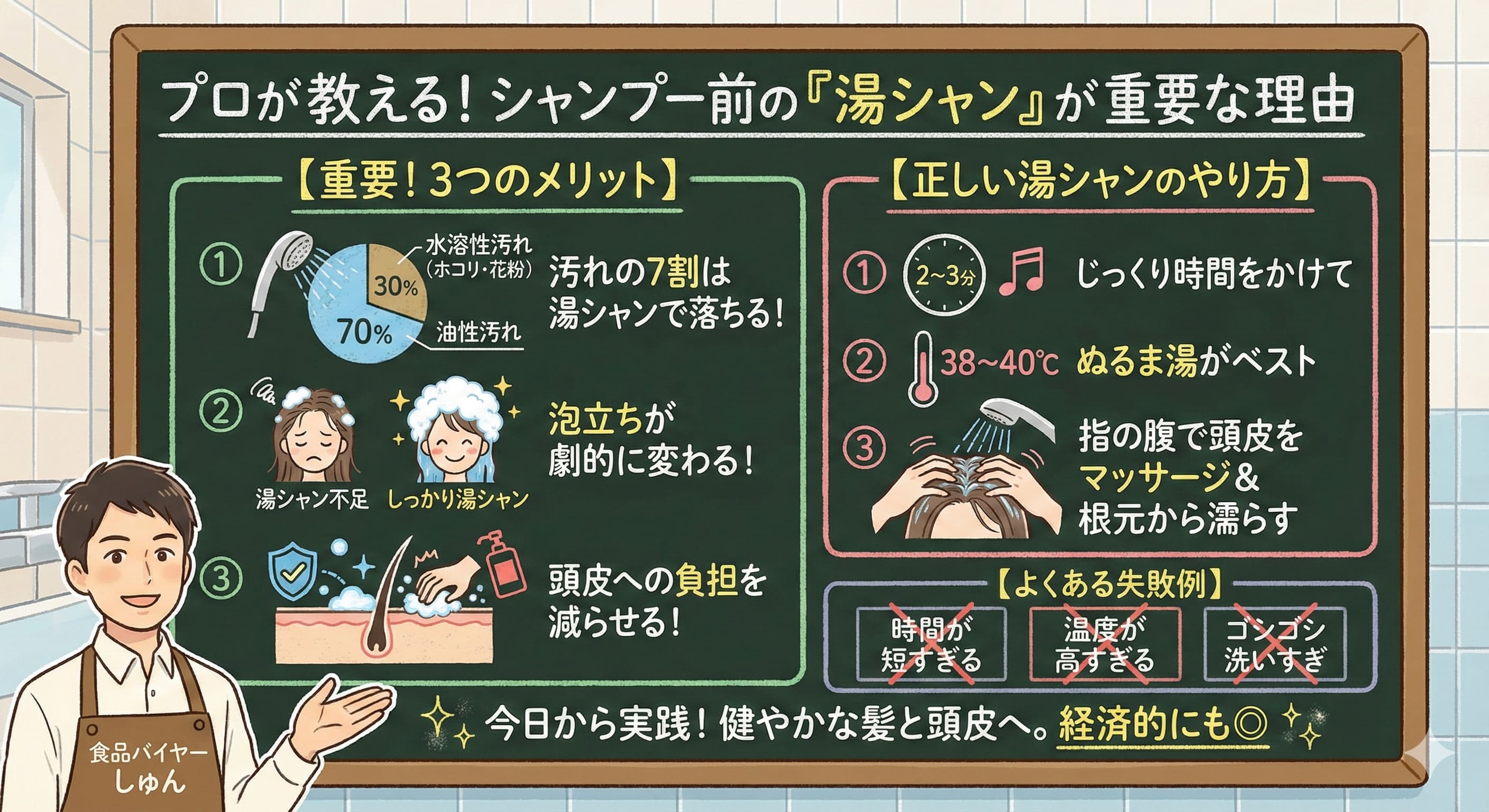 シャンプー前の湯シャン、たった2〜3分の習慣ですが、効果は絶大です。