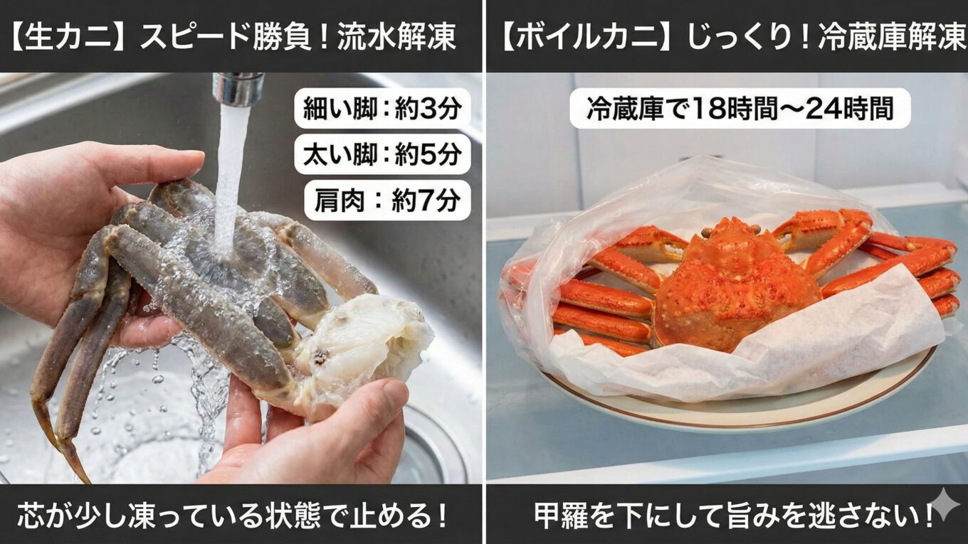 【2026最新】カニの解凍方法ガイド!生は直前流水解凍、ボイルは1日冷蔵庫!